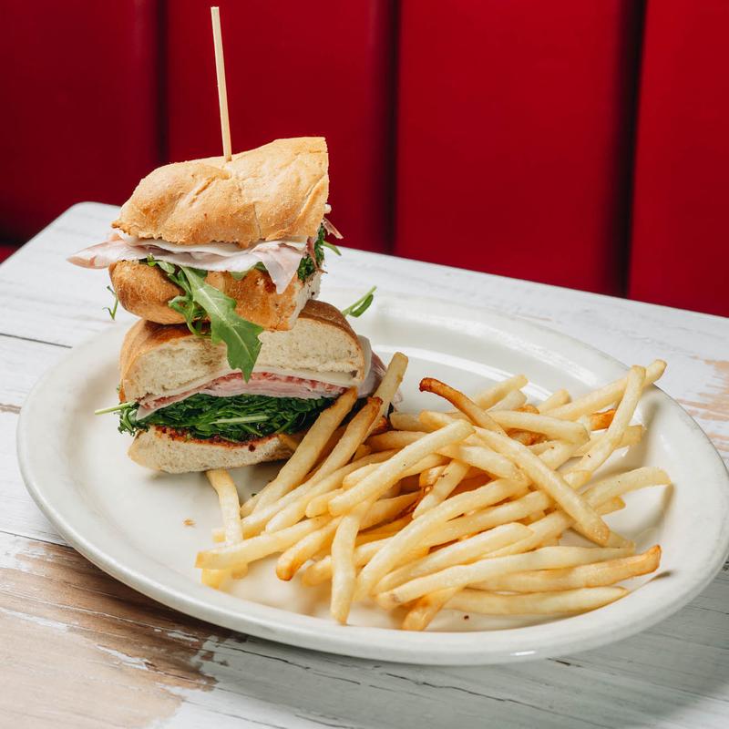 Imported italian meats on toasted rye bread with arugula, provolone, aioli & olive tapenade