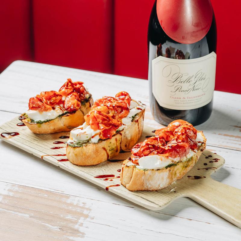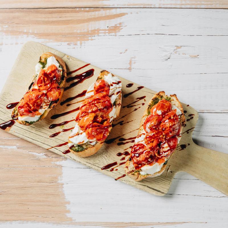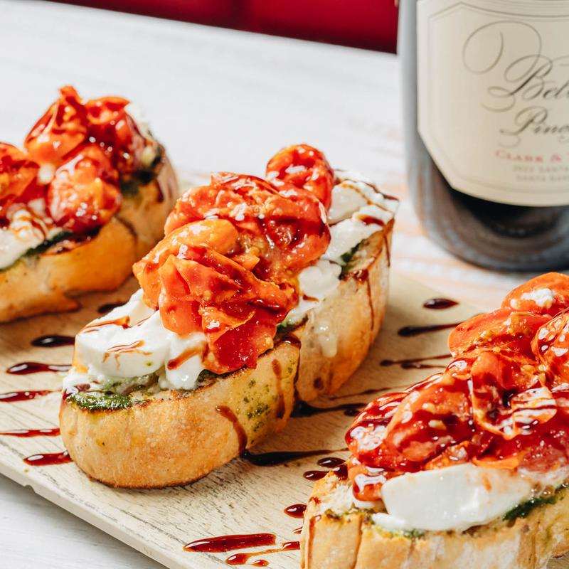 Toasted slices of rustic Italian bread, topped with a luscious, creamy burrata cheese, and finished with a vibrant mix of ripe tomatoes, fresh basil, a drizzle of extra virgin olive oil & balsamic.